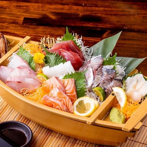我们主要供应大眼金枪鱼,但也少量供应真正的金枪鱼(瘦金枪鱼、中等脂肪金枪鱼和肥金枪鱼)。我们精心挑选来自日本各地渔港的最美味的当季鱼类。我们的肥美刺身拼盘是我们引以为豪的一道菜,希望您首先点这道菜。